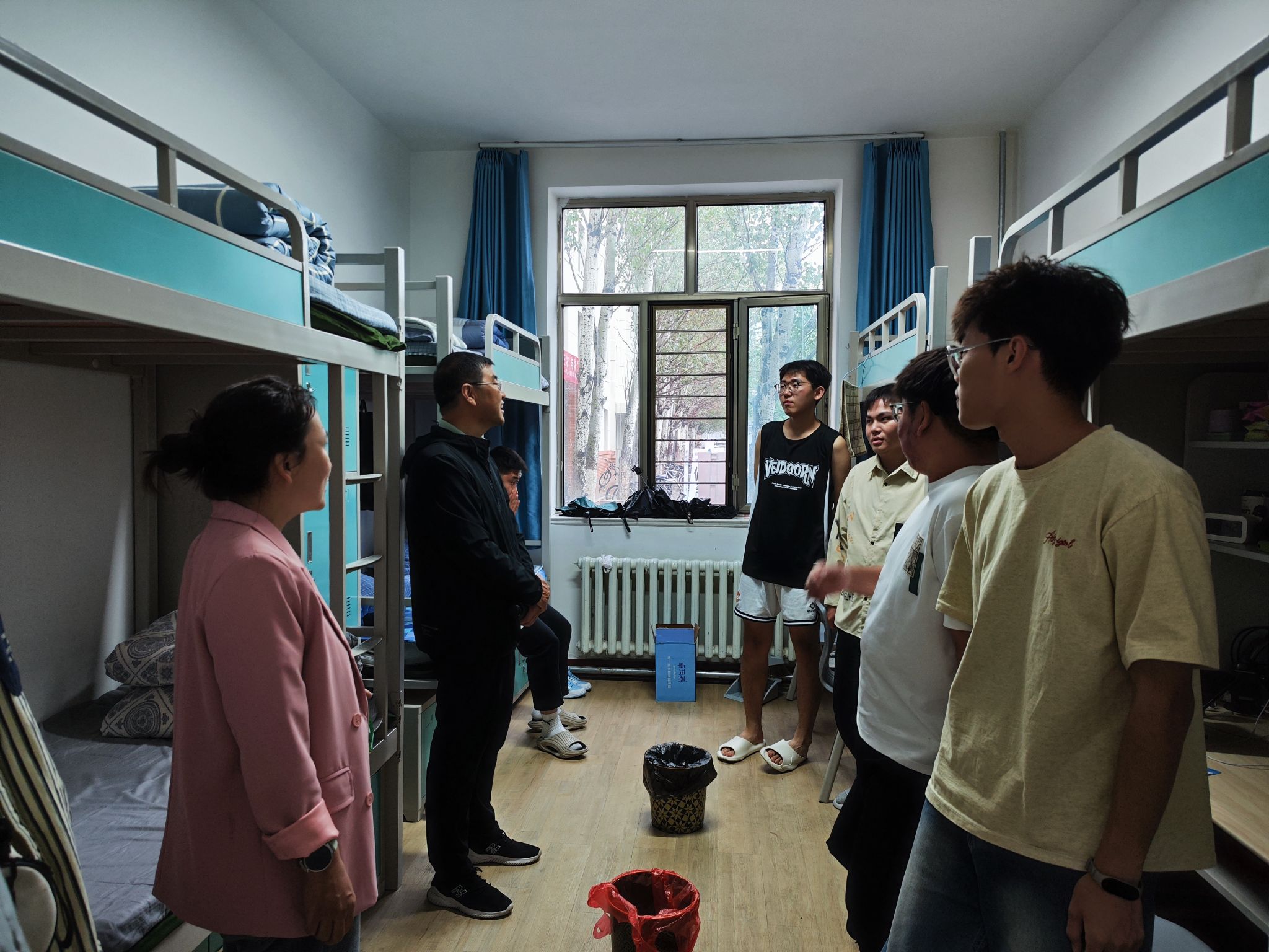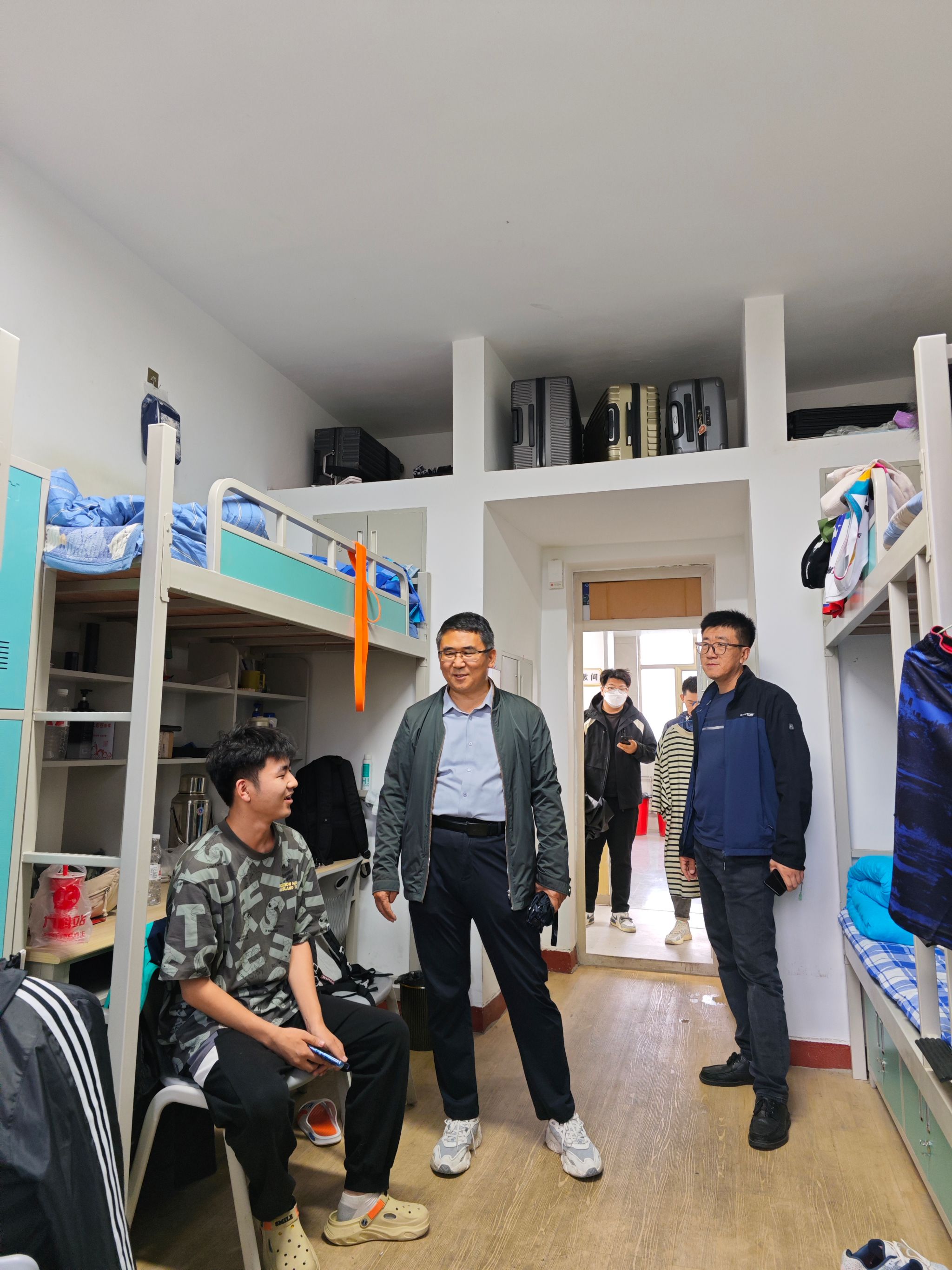 老师们逐一深入宿舍,向新生们致以亲切的问候,并询问了同学们初入大学的适应情况。在交流中,段志峰书记鼓励同学们面对新生活、新环境、新朋友要活泼积极,尽快融入矿煤大家庭中来。同时他强调说,宿舍不仅是学习生活的场所,更是大家共同成长的小家,遇到问题时,要及时向辅导员、班主任寻求帮助和支持。
