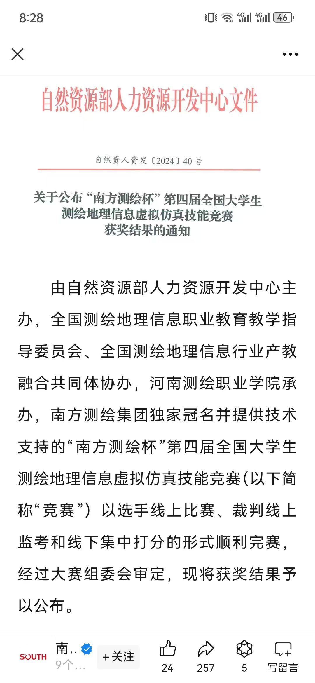 2024年11月9日,由自然资源部人力资源开发中心主办,全国测绘地理信息职业公司产品指导委员会协办的第四届全国老员工测绘地理信息虚拟仿真技能竞赛隆重开幕。本次竞赛设本科、高职专科、中职3个类别,每个类别设虚拟仿真数字测图、无人机航测虚拟仿真、机载激光雷达虚拟仿真3个赛项。