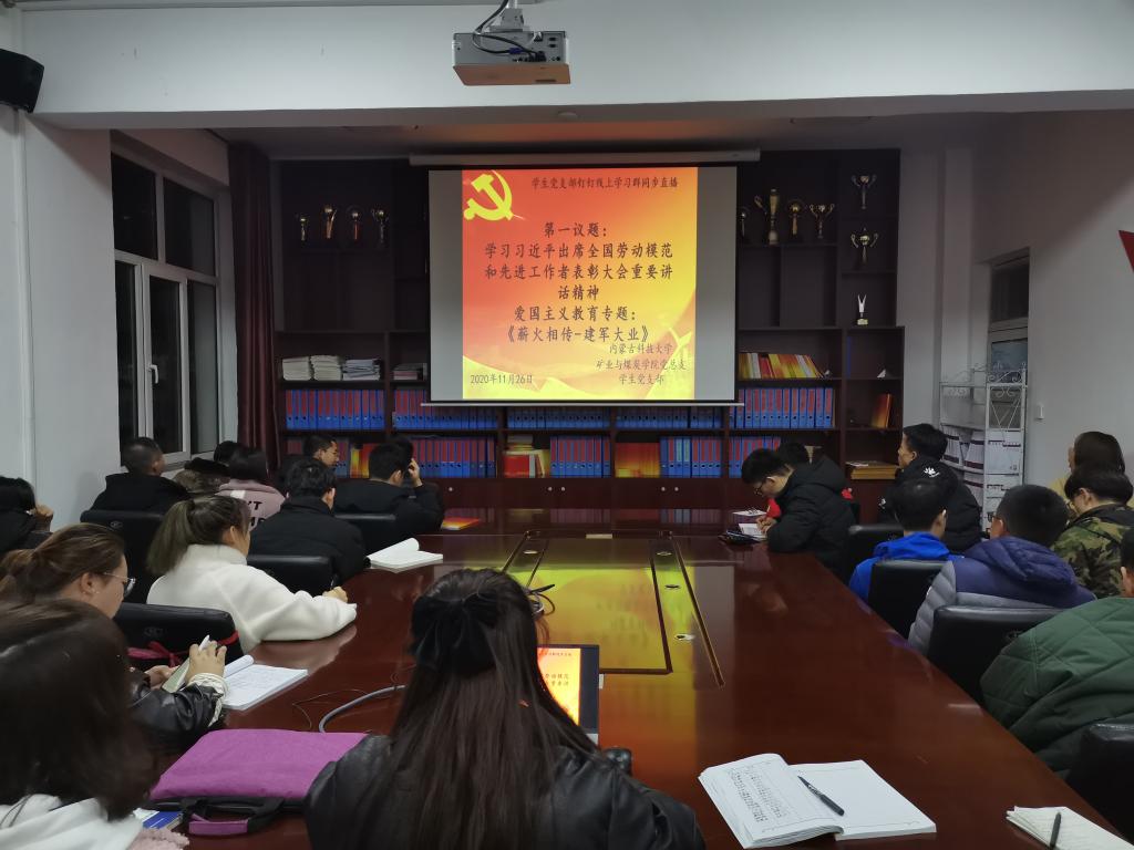 为大力弘扬劳模精神,激励和带动全体员工,bevictor韦德国际党总支于2020年11月26日晚上19:30,在临曦楼二楼党员之家线上线下同步开展专题理论学习活动。本次学习内容是:第一议题:学习习近平出席全国劳动模范和先进工作者表彰大会重要讲话精神;爱国主义教育专题:观看《薪火相传-建军大业》视频。