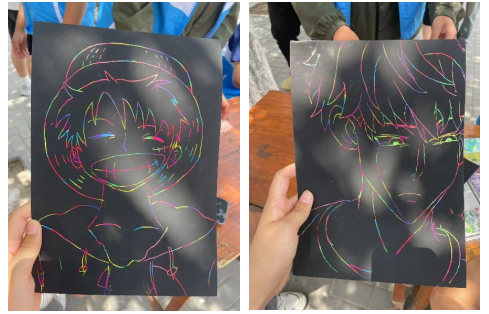 活动开始,工作人员把刮刮画所需画纸与竹签逐一分发给现场参与人员。同学们在拿到工具后,静静构思、仔细端详,在纸上比划着图形大小,利用手中竹签,细致勾勒线条,露出七彩底色。
