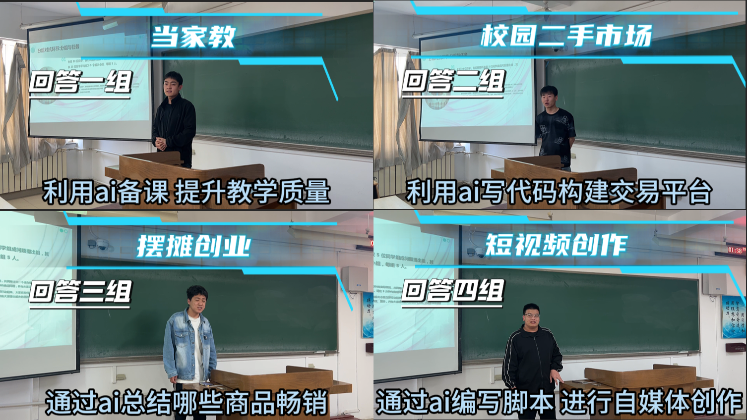 问题组提出“如何用1000元创业”这一贴近现实又具挑战性的话题,充分调动了解决组的思维活力。五支答辩小组在短时间内高效协作,通过使用AI绘图、AI文本生成、思维导图、脚本编辑等工具,展示了从市场调研、项目构思到技术落地的完整流程。